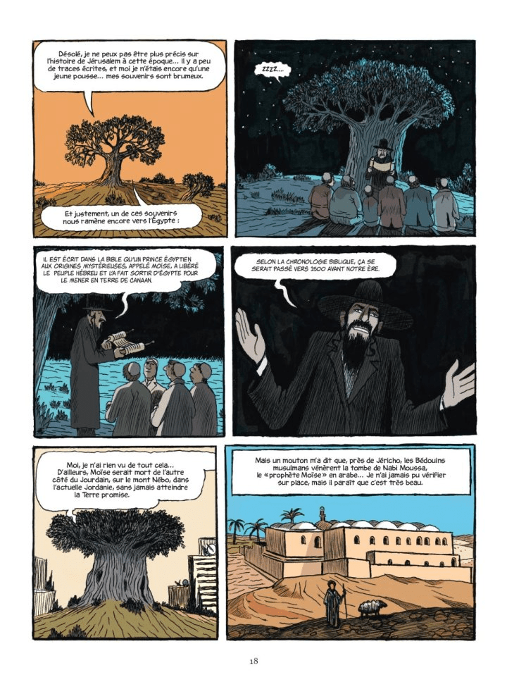Il n’est pas simple de raconter 4 000 ans de l’histoire d’une ville telle que Jérusalem. C’est le projet auquel se sont attelés Christophe Gaultier pour les illustrations et Vincent Lemire pour le scénario et le texte. Christophe Gaultier est un auteur de bandes dessinés. Il travaille également à l’illustration jeunesse. Vincent Lemire et un historien qui a vécu à Jérusalem et qui a écrit un certain nombre de livres sur cette ville. Histoire de Jérusalem est un projet délicat car Jérusalem reste lié au conflit israélo-palestinien. Avec rigueur et pédagogie Christophe Gaultier et Vincent Lemire ont relevé le défi. Celui qui nous présente la ville est un vieil olivier de plus de 4 000 ans. De sa position excentré du Jardin des Oliviers, il a perçu, vu, ressenti les différentes vies de Jérusalem car Jérusalem a vécu, est morte et a renait.