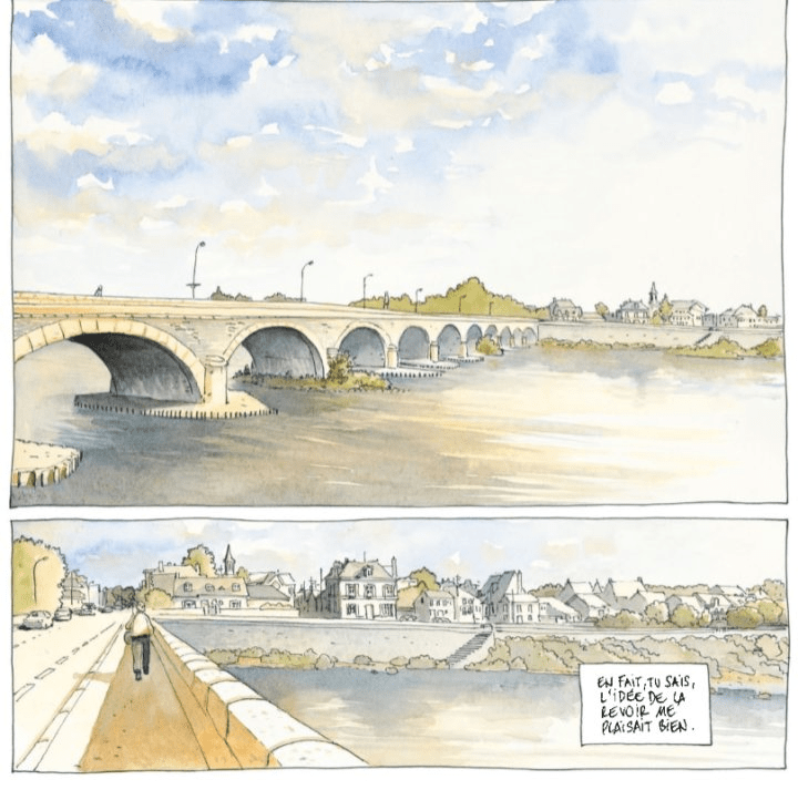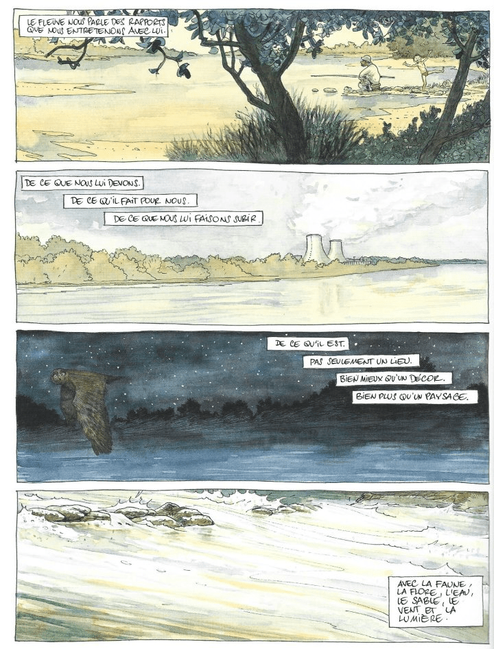 Des aquarelles aux teintes douces que relèvent des couleurs jaunes, ocres et des bleus profonds ombrés . Tel est l atmosphère du dernier roman graphique d’Etienne Davodeau. Ces couleurs pour nous dire un fleuve dont le nom n’est jamais prononcé durant toute la BD. Il est juste nommé dans le titre du roman graphique : Loire sans l’article . Car le fleuve est le personnage central avec une femme Agathe. Néanmoins Etienne Davodeau maintien une ambiguïté dès les première s planches de son album :l Deux planches qui représentent le fleuve un pont et un personnage ayant la soixantaine Louis. Et Louis de dire : « En fait , tu sais, l’idée de la revoir me plaisait bien « . De qui parle Louis : du fleuve ou d’Agathe ? Louis revient au bord du fleuve suite à un mail reçu de la part d’Agathe. Elle l’attend dans sa maison ligérienne. Quand Louis arrive au bord du fleuve Agathe n’est pas au rendez vous. Les personnes présentent sont les hommes et les femmes de sa vie. Il y a donc le fleuve, des hommes et des femmes. La vie qui passe. La vie qui s’en va. le courant du fleuve. Etienne Davodeau a le don à travers ces aquarelles de nous transmettre , le temps qui passe. Des planches en 16/9 sans texte pour nous dire le silence, la méditation et le calme. Il nous laisse le temps de ressentir les mystères du lieu. Associé au fleuve et à la nature , ce groupe d’hommes et de femmes vit lentement autour d’Agathe. le fleuve ou Agathe : Que veulent -ils revoir ? C’est un roman graphique à déguster lentement , se laisser prendre par la majesté des lieux et par les aquarelles d’Etienne Davodeau. Loire est un roman graphique ou le texte s’estompe derrière le rythme du fleuve. « Est ce qu’un fleuve en nous parlant de lui peut nous parler de nous ? ( Page 78 ) Pour complétez cette lecture sur le fleuve je vous conseille le livre de Guillaume Nail : On ne se baigne pas dans la Loire .