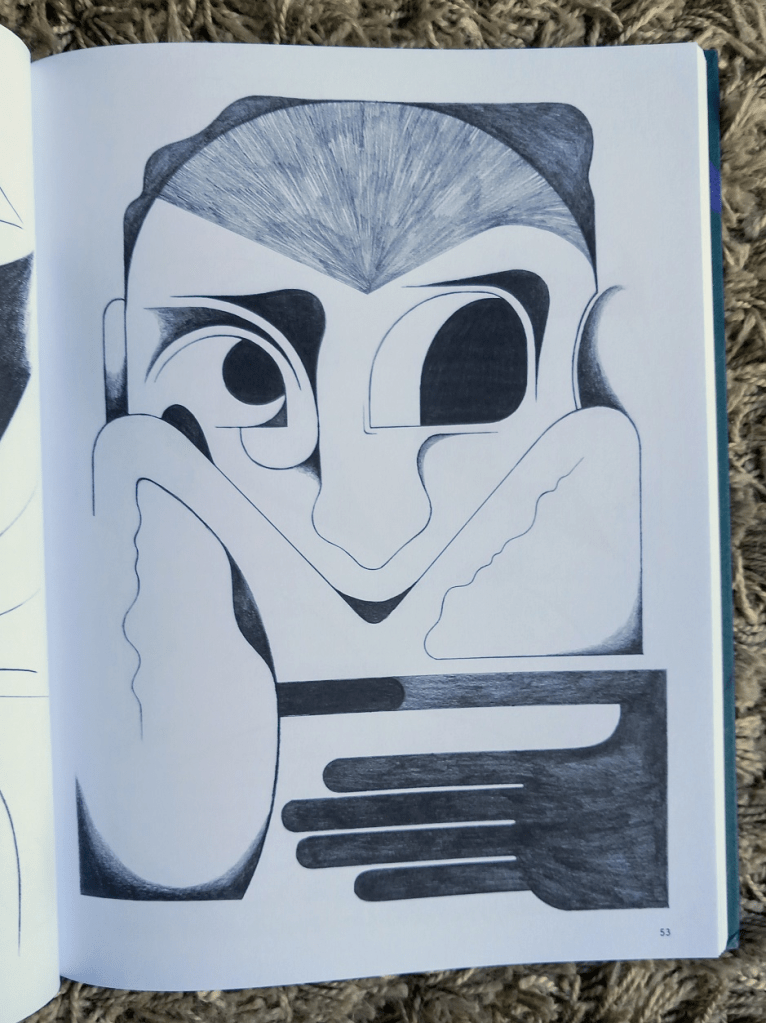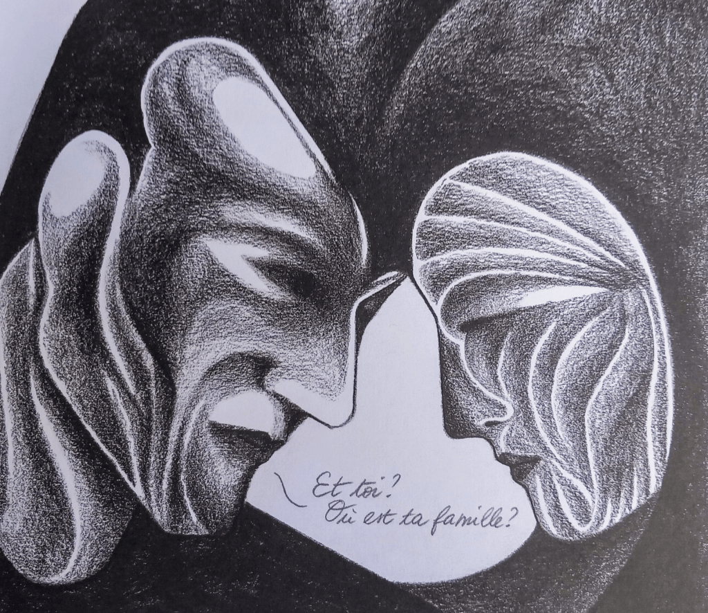 Un dessin noir et blanc au crayon ou au graphite et un texte de la main de l’auteur au crayon. et des plages ou des dessins foisonnant fait de personnages de face, de cĂŽtĂ©, croquĂ©s de loin ou en gros plan.